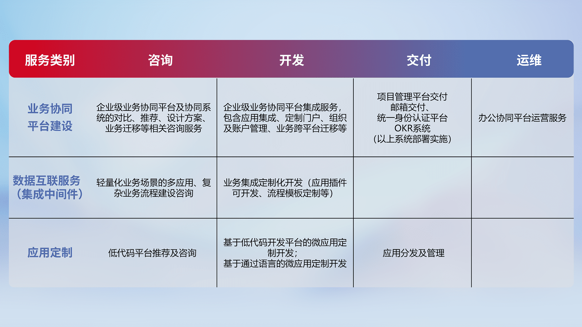 针对钉钉、、、、企微、、IDaas等平台级产品提供产品的规划、、方案、、、、交付、、、定制化开发等服务,,实现如统一协同办公、、、智能客户服务、、混合会议管理、、、智能数据查询、、、等业务场景,,,,实现数字化转型。。